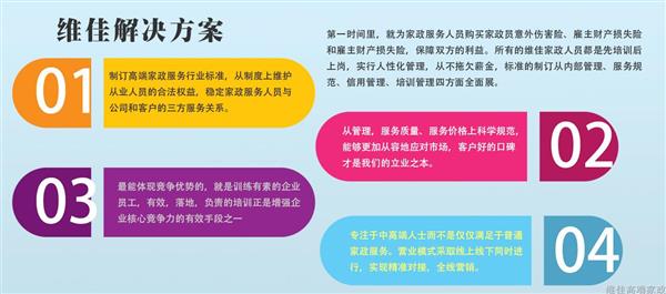 致力于制訂高端家政服務(wù)的行業(yè)標(biāo)準(zhǔn),家政市場才會更有序、更透明。從制度上維護(hù)了從業(yè)人員的合法權(quán)益,穩(wěn)定了家政服務(wù)人員與公司和客戶的三方服務(wù)關(guān)系。